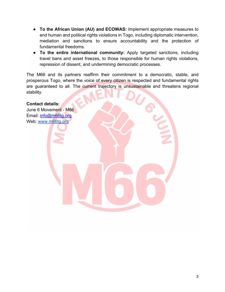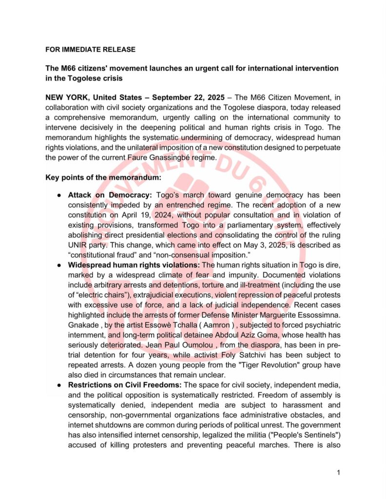 Le Mouvement Citoyen du 6 Juin (M66), en collaboration avec les organisations de la société civile et la diaspora togolaise, publie ce jour un mémorandum de crise, appelant de toute urgence la communauté internationale à intervenir face à la détérioration grave de la situation politique, institutionnelle et des droits humains au Togo.