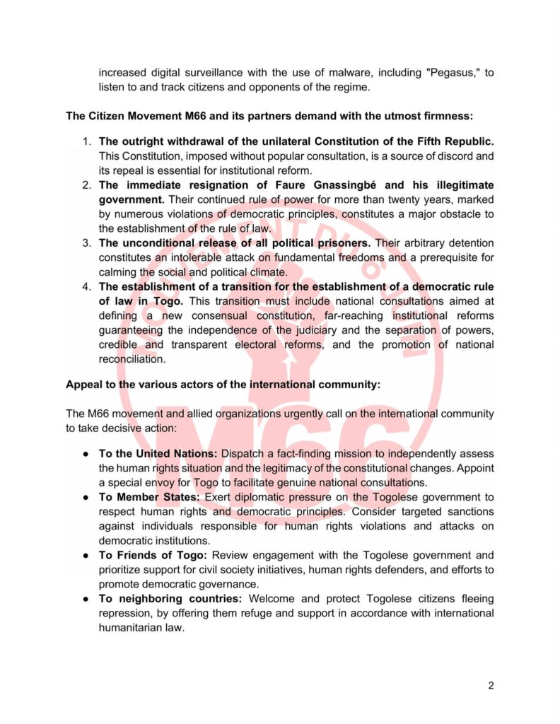Le M66 et ses partenaires réaffirment leur engagement pour un Togo libre, démocratique, stable et prospère, où chaque citoyen a droit à la parole, à la dignité, et à la justice.